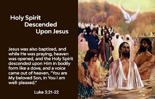 လူအပေါင်းတို့သည် ဗတ္တိဇံကိုခံကြသောအခါ၊ ယေရှုသည်လည်း ဗတ္တိဇံကိုခံတော်မူ၍ ဆုတောင်းစဉ်တွင်၊ ကောင်းကင်ဖွင့်လှစ်သဖြင့်၊- သန့်ရှင်းသောဝိညာဉ်တော်သည် ချိုးငှက်ကဲ့သို့ ကိုယ်ထင်ရှားလျက် ကိုယ်တော်အပေါ်၌ ဆင်းသက်တော်မူ၍၊ သင်ကား၊ ငါနှစ်သက်မြတ်နိုးရာ၊ ငါ၏ချစ်သားပေတည်းဟု ကောင်းကင်က အသံတော်ဖြစ်လေ၏။_ရှင်လုကာ ၃:၂၁-၂၂